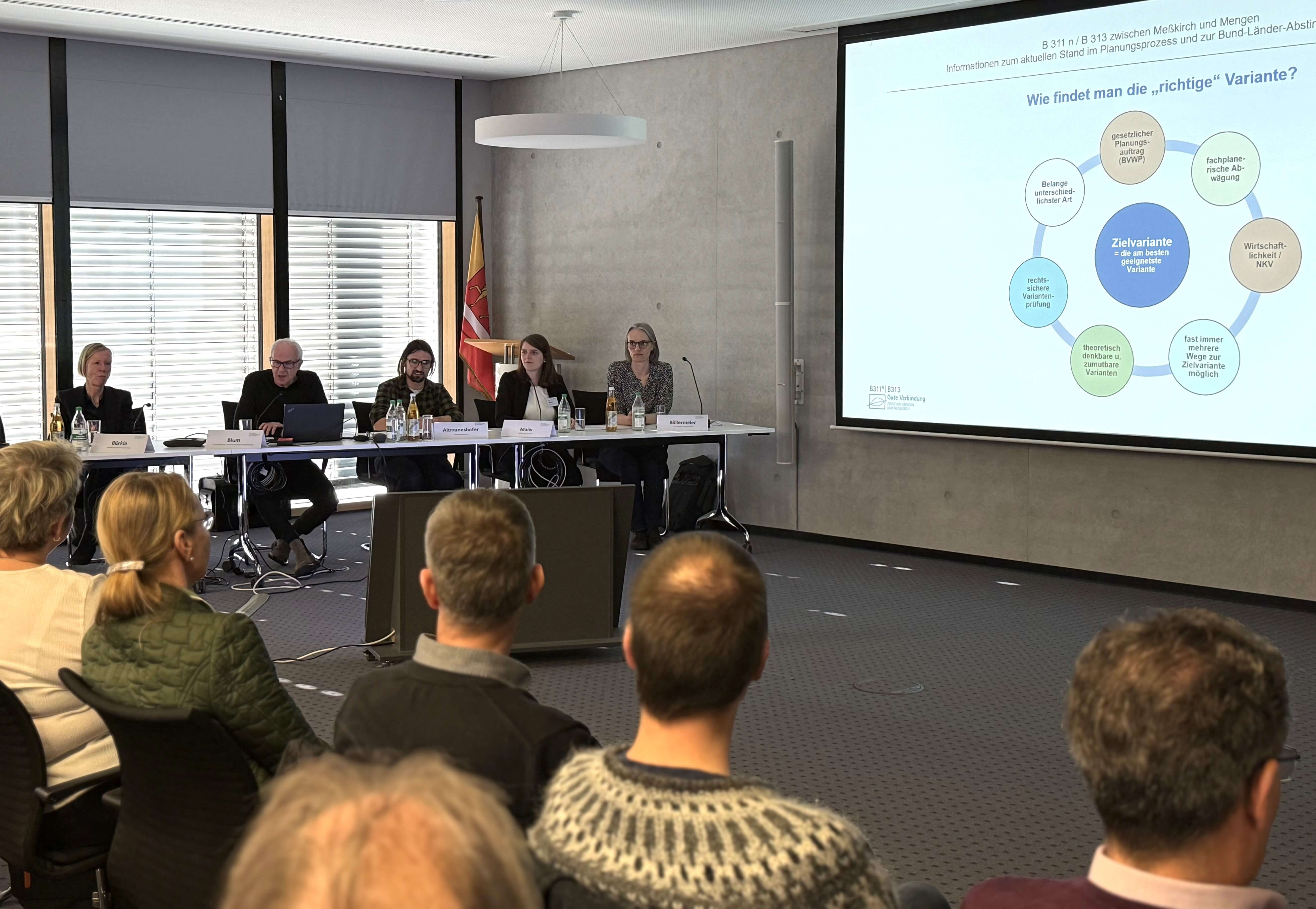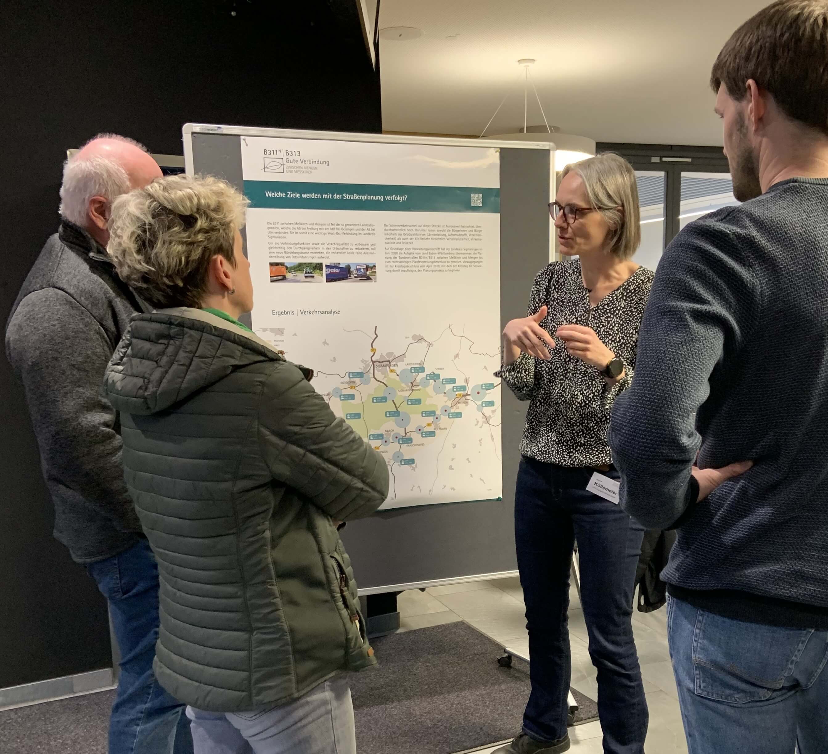 Mehr als 120 Menschen fanden sich am 20. März 2026 im Landratsamt Sigmaringen ein, um sich über den aktuellen Stand der Planungen rund um die B311n/B313 zu informieren. Neben Landrätin Stefanie Bürkle und Projektleiter Thomas Blum standen den interessierten Bürgerinnen und Bürgern die beteiligten Gutachter*innen zum fachlichen Austausch zur Verfügung.
